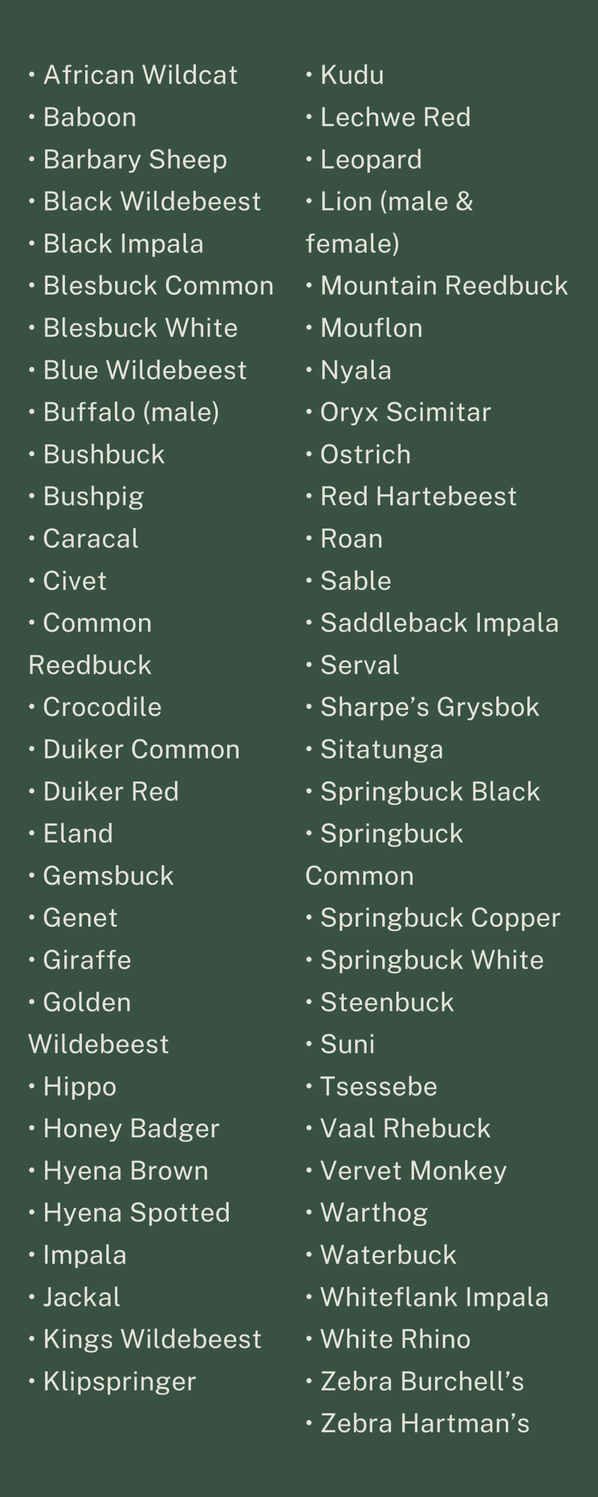Below is a comprehensive list of animals available for hunting. Don't see what you're looking for? Just ask and we will do our best to accomodate you.